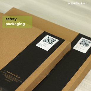 Selain aspek keamanan, kami juga sangat concern terhadap sisi estetika dari kemasan produk Malika Wallart. Desain yang dibuat berbentuk minimalis dengan didominasi warna cokelat dan aksen hitam di beberapa bagian. Dua kombinasi yang menciptakan kesan elegan dalam produk tersebut. Selain itu, kami tidak lupa memasang bar code yang berisikan jenis produk kami. Sehingga dipastikan bahwa pengiriman produk sesuai dengan pemesanan. Kami juga memberikan informasi mengenai website, alamat dan akun media sosial kami. Hal ini kami lakukan agar pembeli selalu ingat untuk kembali membeli produk hiasan dinding kami kembali.